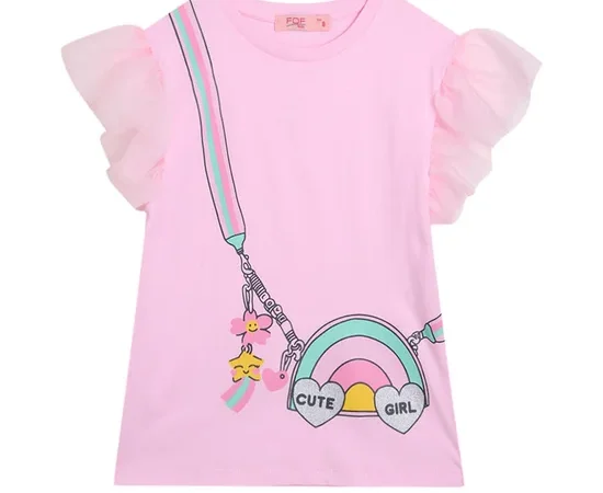 FOF KIDS Girl T-Shirt Flutter Sleeves Mini Bag Print Pink