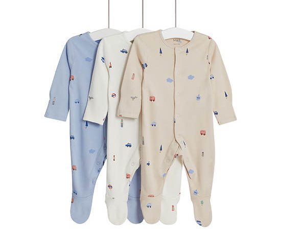 MARKS & SPENCER KIDS Unisex Toddler Sleepsuits Pure Cotton London 3 Pk Ecru Mix