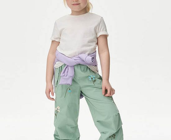 MARKS & SPENCER KIDS Girl Toddler Trousers Pure Cotton Embroidered Parachute Green