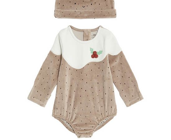 MARKS & SPENCER KIDS Girl Toddler Outfit Velour Christmas Pudding 2 Pc Soft Brown