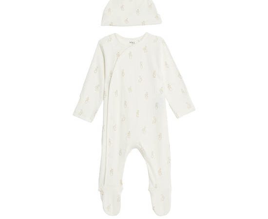 MARKS & SPENCER KIDS Unisex Toddler Sleepsuit and Hat Peter Rabbit 2 Pc Cream Mix