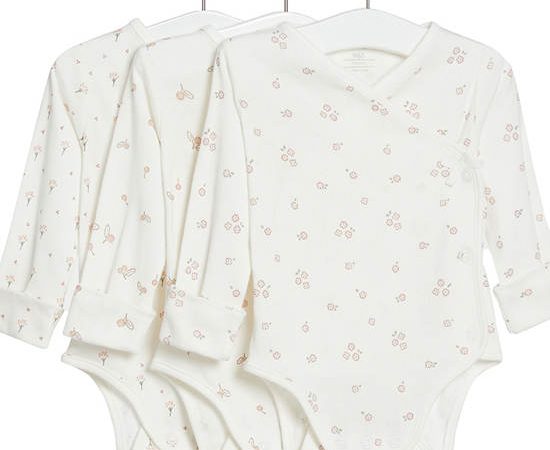 MARKS & SPENCER KIDS Unisex Toddler Bodysuits Pure Cotton Floral 3 Pk Cream Mix