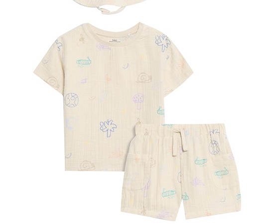 MARKS & SPENCER KIDS Boy Toddler Shorts with Hat Outfit Print 3 pcs Ecru