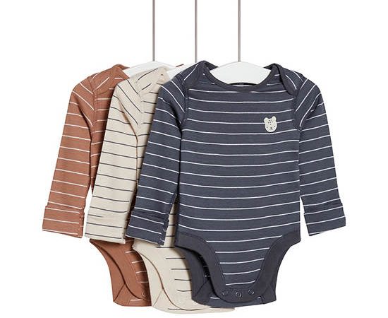 MARKS & SPENCER KIDS Boy Toddler Bodysuits Pure Cotton Striped & Bear Bodysuits 3 Pk Carbon
