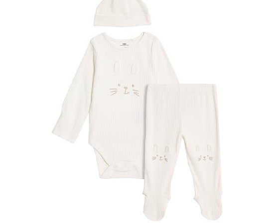 MARKS & SPENCER KIDS Unisex Toddler Outfit Cotton Rich Bunny 3 Pc Cream Mix