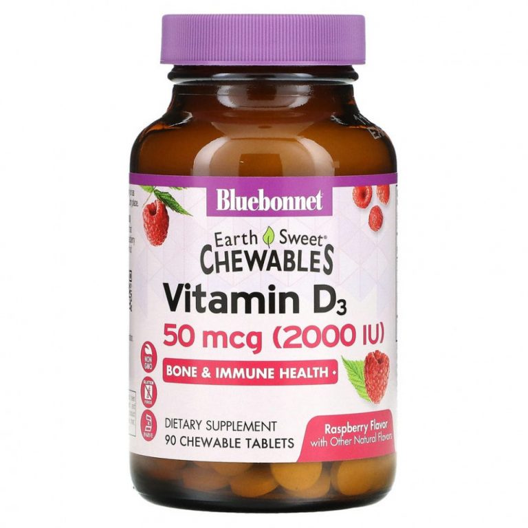 Bluebonnet Nutrition, Earth Sweet Chewables, витамин D3, со вкусом малины, 2000 МЕ, 90 жевательных таблеток
