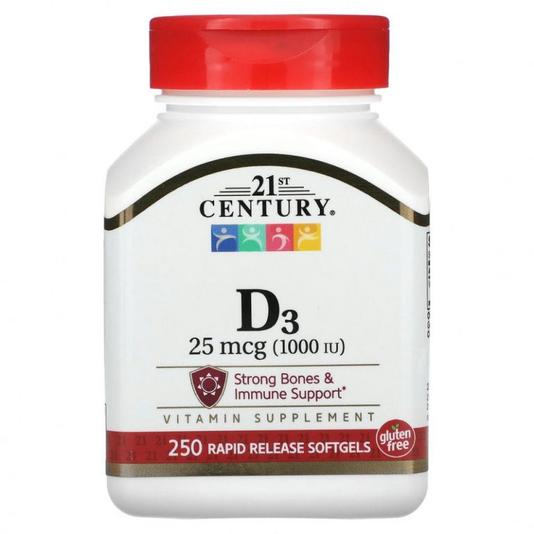 21st Century, Витамин D3, 25 мкг (1000 МЕ), 250 мягких таблеток с быстрым высвобождением