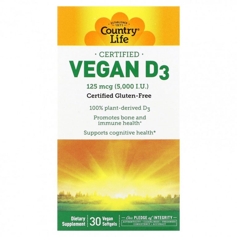 Country Life, Сертифицированный веганский витамин D3, 125 мкг (5000 МЕ), 30 веганских мягких таблеток