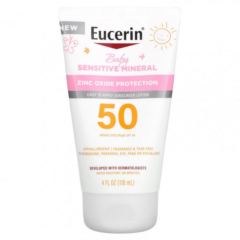 Eucerin, Для детей, минеральный солнцезащитный лосьон для чувствительной кожи, SPF 50, без отдушек, 118 мл (4 жидк. Унции)