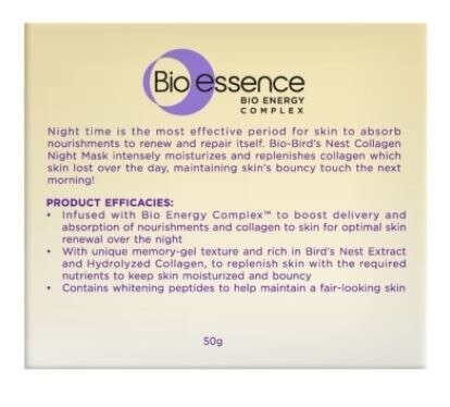 Bio-Essence Bird’s Nest Nutri-Collagen Night Mask Night time is the most effective period for skin to absorb nourishments to renew and repair itself. Bio-Birds Nest Collagen Night Mask intensely moisturizes and replenishes collagen which skin lost over the day, maintaining skins bouncy touch the next morning! Infused with Bio Energy Complex to boost delivery and absorption of nourishments and collagen to skin for optimal skin renewal over the night. With unique memory-gel texture and rich in Birds Nest Extract and Hydrolyzed Collagen, to replenish skin with the required nutrients to keep skin moisturized and bouncy. Contains whitening peptides to help maintain a fair-looking skin