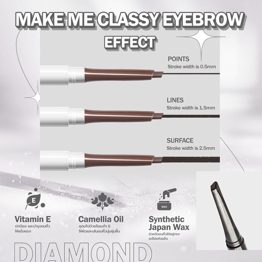 Barenbliss Classy Eyebrow 0.16g. A diamond-shaped tip Matic pencil infused with natural oil to draw a healthy groomed brow USP 1. Buildable Diamond Shape 2. Lasting Neutral Color 3. Well-Nourished Brow Special Ingredients 1. Camellia Oil Rich in Omega-6 that keeps skin and hair moist and supple 2. Vitamin E As an antioxidant to protect and nourish your eyebrow 3. Synthetic Japan Wax That holds your hairs in place without stiffness. 2 shades, Barenbliss Classy Eyebrow 0.16g 01 Walnut Brown and Barenbliss Classy Eyebrow 0.16g 02 Hot Chocolate