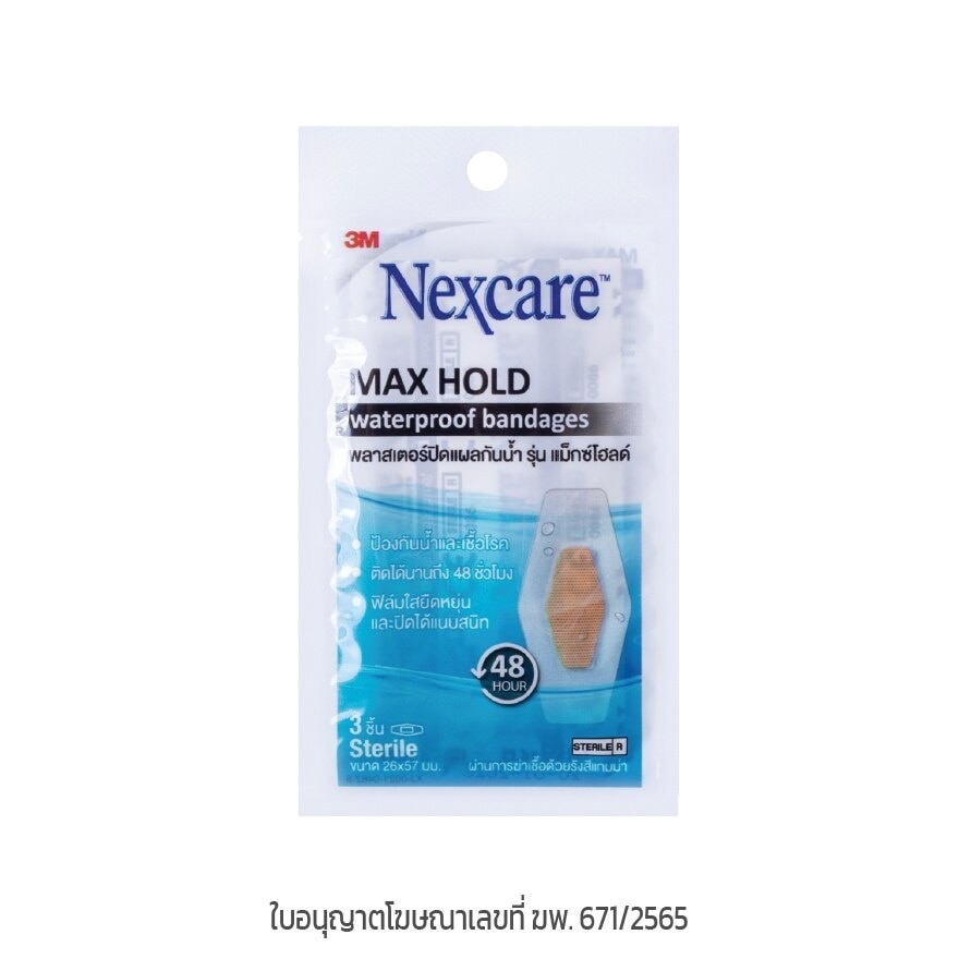 Nexcare Max Hold Waterproof Bandages. Ready for any adventure, the bandages hold securely for up to 48 hours even while youre hiking, skateboarding or rock climbing. Tough but discreet, Max Hold Bandages flex, contour, and seal out water, dirt, and germs with every move. Featuring a protective center surrounded by durable film, these first aid bandages stay on for up to 48 hours. Keep going strong with Nexcare Max Hold Waterproof Bandages, a tough addition to your first aid kit. Max Hold design stays on until you take it off for up to 48 hours. Comfortable, low-profile film fits close to the skin. Helps waterproof, dirtproof, and germproof your wounds. Contours to hard-to-fit places, like heels, the hand, knees, and fingers. Thin and clear so you hardly notice its there. Stays on when handwashing or showering. Flexible construction for lasting comfort. A great addition to any first aid kit. Available In 15 ct. Assorted, 40 ct. Assorted, 60 ct. One Size, 6 ct. Knee amp; Elbow, 6 ct. Heel amp; Hand. Not made with natural rubber latex ใบอนุญาตเลขที่ฆพ.671/2565