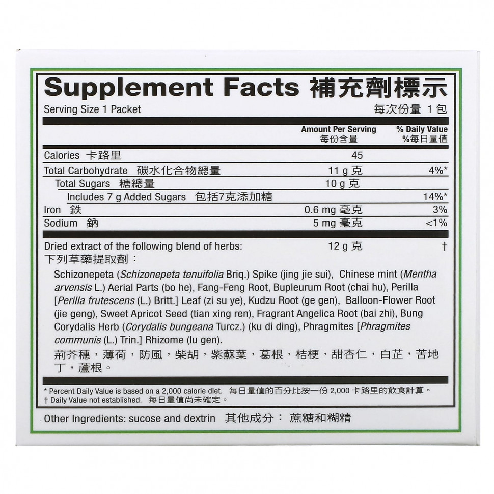 Сушеный экстракт из смеси трав: Шизонепета (Schizonepeta tenuifolia Briq.) Шип (jing jie sui), китайская мята (Mentha arvensis L.) Надземные части (бо хе), корень фанг-фэн, корень волынки (chai hu), перилла [Perilla frutescens (L.) Бритт.] Лист (zi su ye), корень кудзу (ge gen), корень воздушного шара (цзе гэн), семена сладкого абрикоса (тянь син жень), ароматный корень дудника (бай чжи), бунг Хохлатка (Corydalis bungeana Turcz.) (Ku di ding), Phragmites [Phragmites communis (L.) Trin.] Корневище (lu gen). |