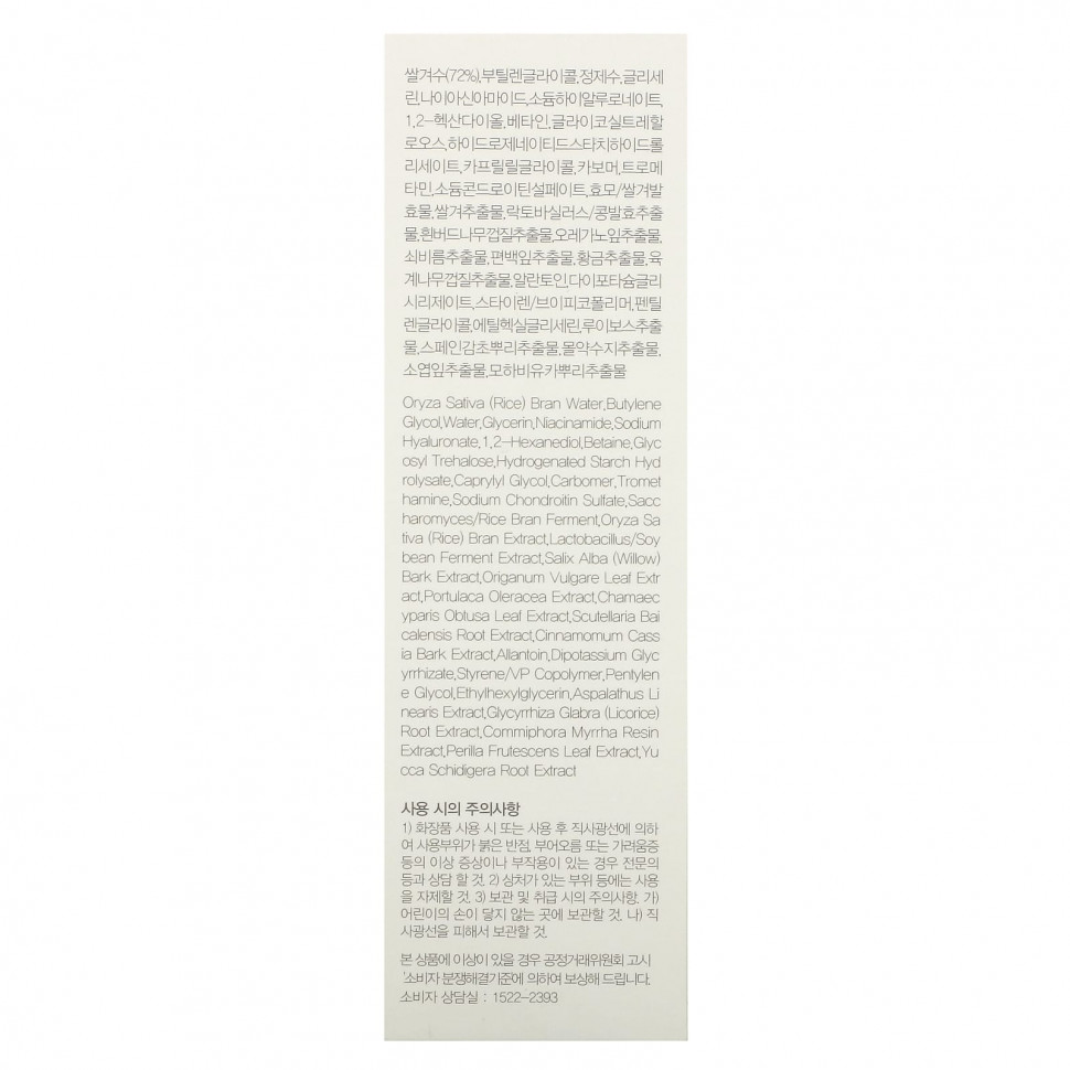 Вода из рисовых отрубей Oryza sativa, бутиленгликоль, вода, глицерин, ниацинамид, гиалуронат натрия, 1,2-гександиол, бетаин, гликозил трегалоза, гидрогенизированный гидролизат крахмала, каприлилгликоль, карбомер, трометамин, хондроитин сульфат натрия, сахаромицеты / фермент из рисовых отрубей, экстракт рисовых отрубей (Oryza sativa), ферментированный экстракт лактобактерий / соевых бобов, экстракт коры ивы (Salix alba), экстракт листьев орегано (Origanum vulgare), экстракт портулака огородного (Portulaca oleracea), экстракт листьев хаммы обтуза (Chamaecyparis obtusa), экстракт корня шлемника (Scutellaria baicalensis), экстракт коры кассии (Cinnamomum cassia), аллантоин, дикалия глицирризат, сополимер стирола / ВП, пентилен гликоль, этилгексилглицерин, экстракт аспалата линеарис, экстракт корня солодки (Glycyrrhiza glabra), экстракт камеди коммифоры мирровой (Commiphora myrrha), экстракт листьев периллы (Perilla ocymoides), экстракт корня юкки Шидигера (Yucca schidigera)