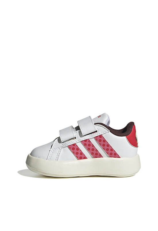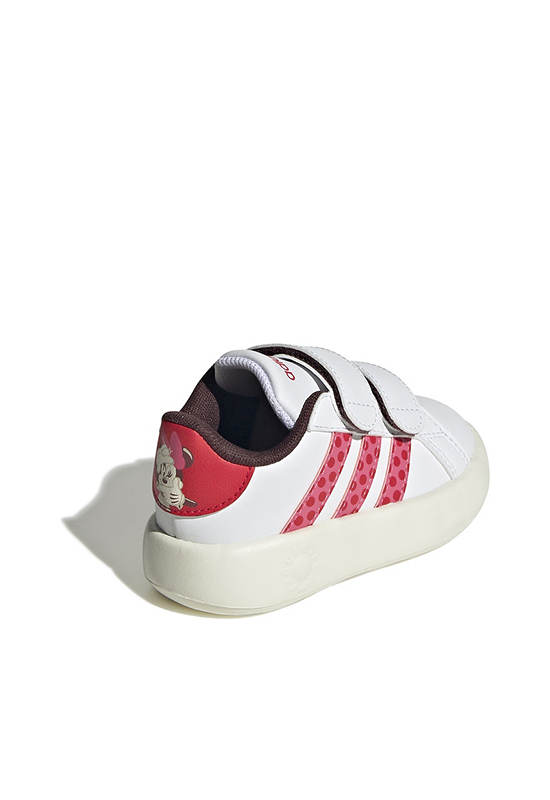ADIDAS KIDS Introducing the adidas Disney Minnie Grand Court 2.0 Shoes for infants — a playful blend of comfort and style. Designed with a regular fit, these shoes are perfect for fun and play. Crafted from durable synthetics, they feature an infant-friendly soft EVA unitsole and adjustable hook-and-loop straps for easy on and off. The design pays homage to the iconic adidas sportswear court model, reimagined with delightful Minnie Mouse prints on the heel and polka dots on the 3-stripes. Made in part with recycled materials, these shoes offer a sustainable choice for your little one’s adventures. The soft Bubblecomfy EVA tooling provides comfort and flexibility, making them an ideal choice for everyday wear.