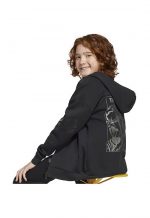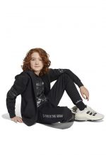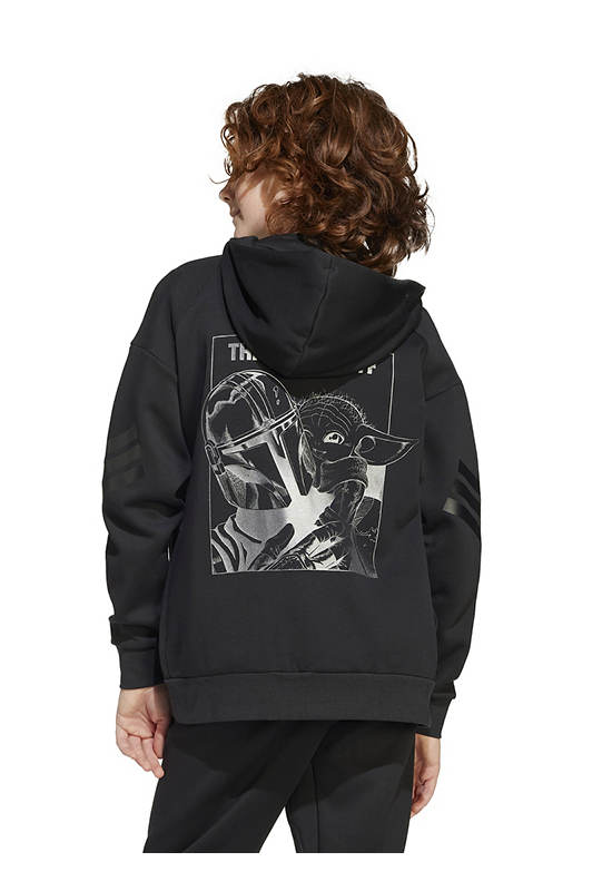 ADIDAS KIDS Embark on an intergalactic adventure with the adidas Star Wars Mandalorian Track Top. This unisex, regular fit hooded top is made in part with Better Cotton and recycled Polyethylene Terephthalate. The design story is inspired by the outer reaches of the galaxy, featuring a monochrome Mandalorian print in shimmer execution at the back. This track top is a testament to adidas’ partnership with Walt Disney, offering a stylish and comfortable journey through the stars.
