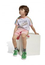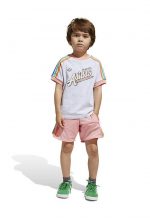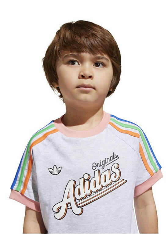 ADIDAS KIDS This adidas shorts and tee set for kids was made for sunny days. The soft, single jersey fabric and loose shape keep them comfortable as they run and play. Retro-inspired tri-colour 3-Stripes and an oversized adidas Originals logo add sporty finishes. *By choosing recycled, we are able to reuse materials that have already been created, which helps to reduce waste. Renewable materials choices will help us to remove our reliance on finite resources. Our products made with a blend of recycled and renewable materials feature at least 70% total of these materials.