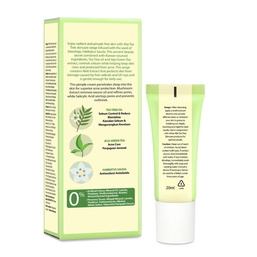 Enjoy radiant and pimple free skin with Alia Tea Tree skincare range infused with the seed of blessing, Habbatus Sauda. This ancient beauty secret combined with Korean-sourced ingredients, Tea Tree Oil and Jeju Green Tea extract, controls sebum while helping keep skin clear and protected from acne. This range contains Malt Extract that protects skin from damage caused by free radicals and UV rays and is gentle enough for daily use, This Alia Tea Tree Pimple Cream penetrates deep into the skin for superior acne protection. Mushroom Extract removes excess oil and refines pores, while Salicylic Acid unclogs pores and prevents outbreak. Free from Artificial Colour, Mineral Oil, Lanolin, Parabens, Alcohol, Animal Derived Ingredients.