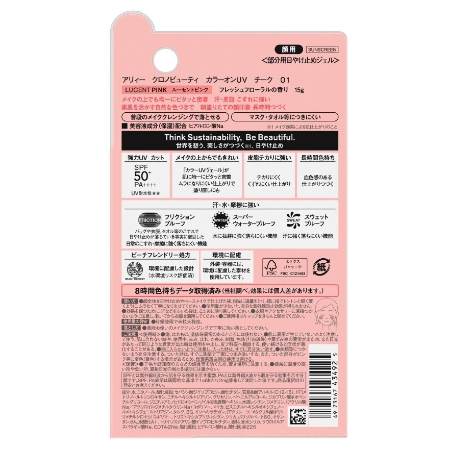 Allie Chrono Beauty Color On UV Cheek 01 SPF50+PA++++ (LUCENT PINK) UV protection even for blush makeup. Resistant to sweat, sebum, and abrasion. Color on UV allows the just-applied morning look to last. 8 hours of color retention proven by data (Surveyed by Kanebo. Effectiveness may vary depending on the user) SPF 50+, PA++++ , Friction proof. Super waterproof. Resistant to sebum, resists glare. Beach friendly formula Designed with regulation in mind for some countries, regions, and beaches. Technological Features Successfully combines SPF50+ and natural coloration. Color UV Veil Technology (including capsules). The pigment and UV-blocking ingredient are encased in capsules to adhere tightly and evenly to skin without mixing with base makeup. Achieves natural coloration, making the most of your own skin, while retaining SPF50+ and the comfortable texture.