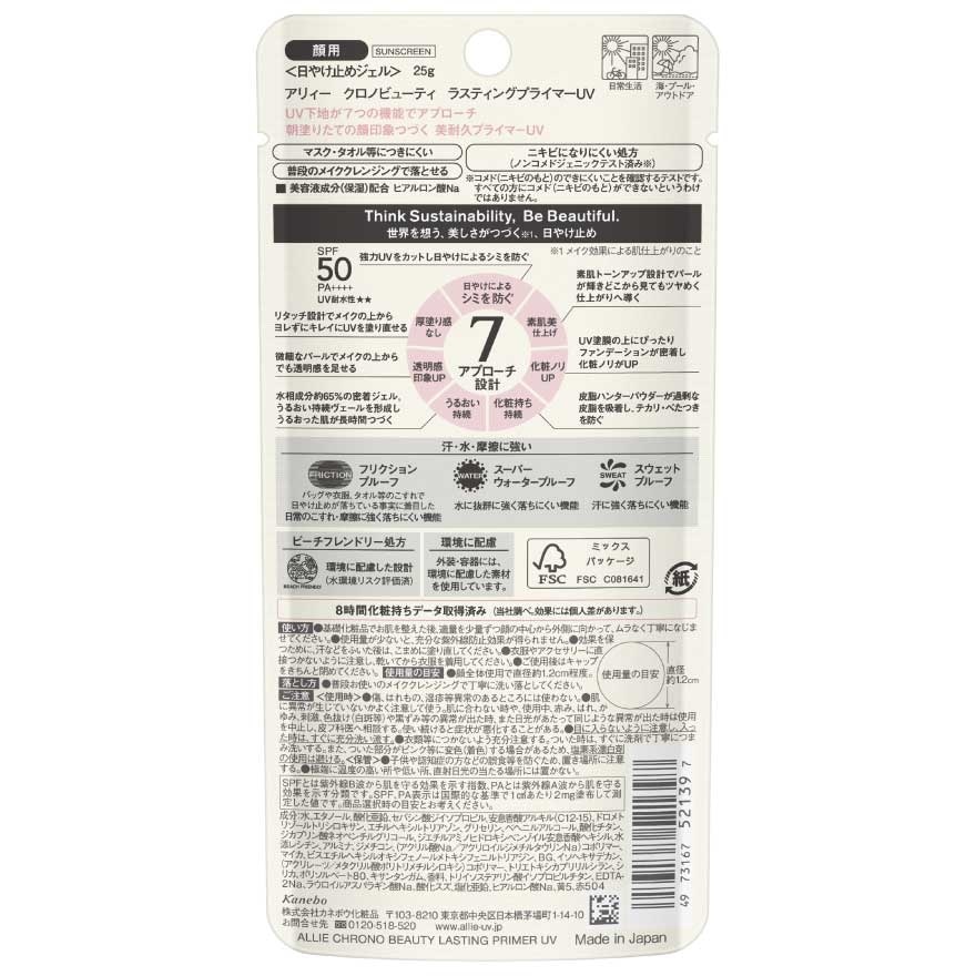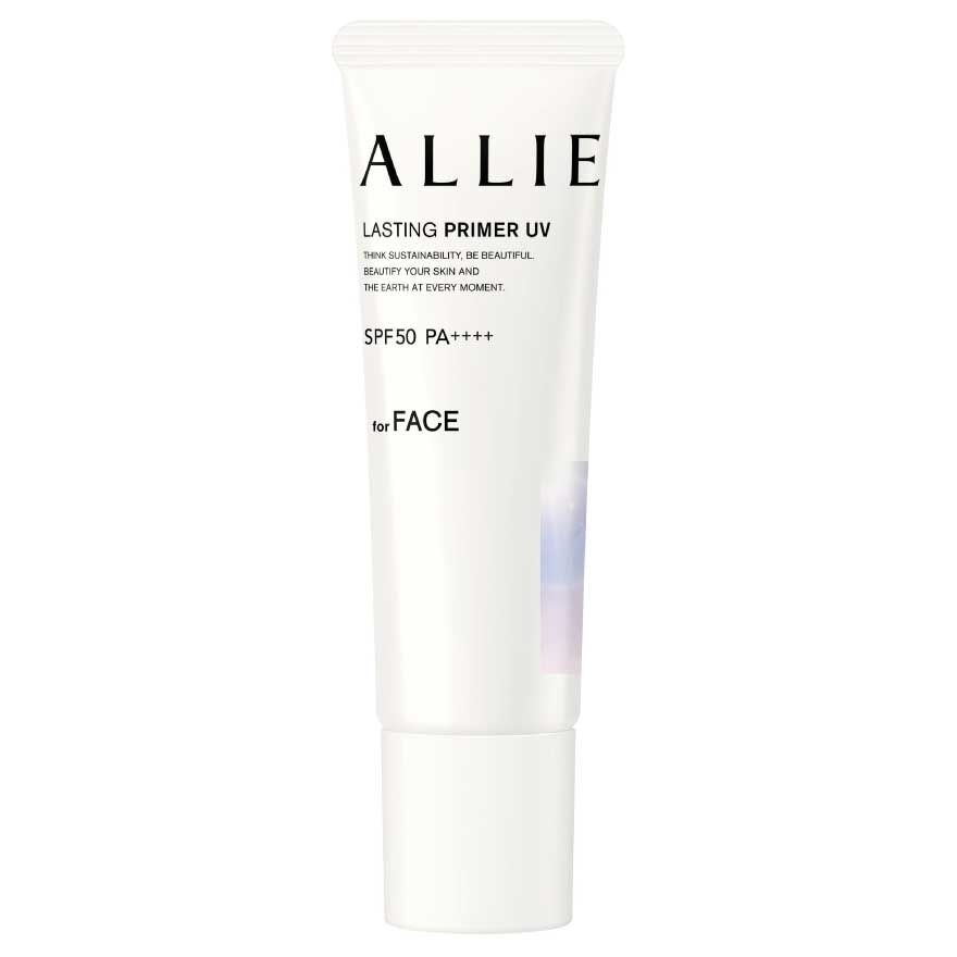 Allie Chrono Beauty Lasting Primer UV Sunscreen SPF50 PA++++ for face with clear pink color. Prevents spots and freckles caused by sun exposure. 7 approaches and effects felt. UV Primer. — Prevents spots caused by sun exposure. — This product makes bare skin look beautiful. — Following foundation applies smoother. — Makeup lasts for a long time. — Lasting moisturizing effects — Gives the impression of increased translucency. — Does not give heavy or thick feeling. Friction proof. Super waterproof. Contains Sebum Hunter powder. Darjeeling & Bergamot Fragrance. Prevents debris, dust, pollen, and other fine particles including PM 2.5 from sticking. (Does not prevent the adhesion of all fine particles. Beach friendly formula: Designed with regulation in mind for some countries, regions, and beaches.