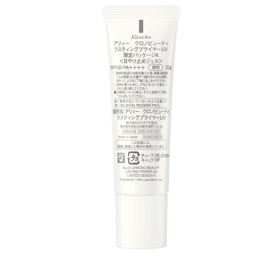 Allie Chrono Beauty Lasting Primer UV Sunscreen SPF50 PA++++ Allie x Kirby for face with clear pink color. Prevents spots and freckles caused by sun exposure. 7 approaches and effects felt. UV Primer. — Prevents spots caused by sun exposure. — This product makes bare skin look beautiful. — Following foundation applies smoother. — Makeup lasts for a long time. — Lasting moisturizing effects — Gives the impression of increased translucency. — Does not give heavy or thick feeling. Friction proof. Super waterproof. Contains Sebum Hunter powder. Darjeeling amp Bergamot Fragrance. Prevents debris, dust, pollen, and other fine particles including PM 2.5 from sticking. (Does not prevent the adhesion of all fine particles. Beach friendly formula Designed with regulation in mind for some countries, regions, and beaches.