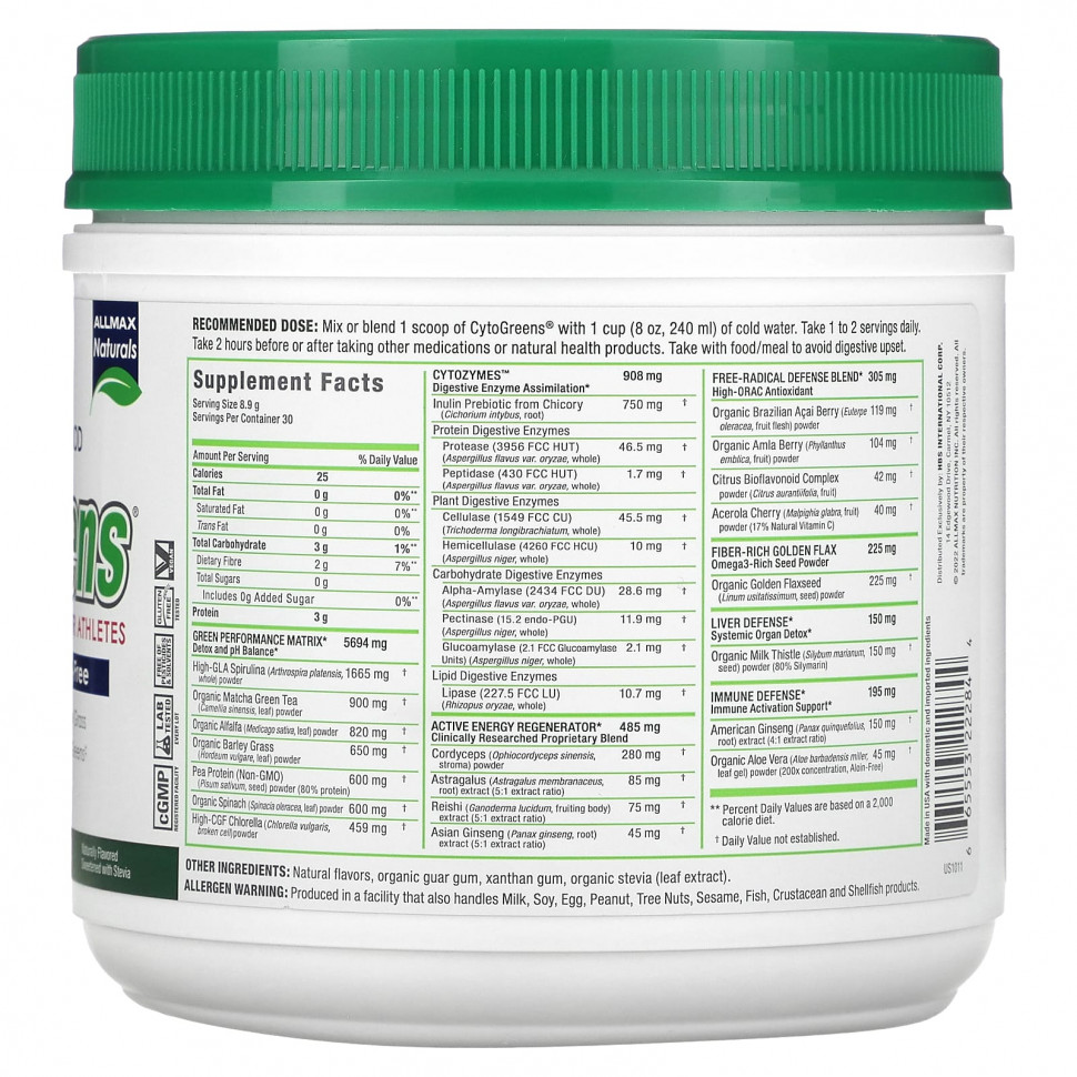 CytoGreens® содержит более 300 мг стандартизированных, нейтрализующих свободные радикалы антиоксидантов с высоким содержанием ORAC (1,2 г, если считать зеленый матча). Он также содержит Cytozymes, специально разработанную смесь из 8 ферментов с высокой эффективностью, которая в 20 раз превышает ферментативную активность ведущих «зеленых» добавок. Цитомы помогают расщеплять необработанные цельные пищевые ингредиенты, помогая высвобождать питательные вещества для оптимального пищеварения и биодоступности.