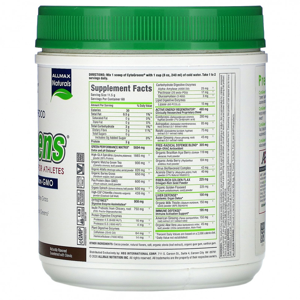 CytoGreens® содержит более 300 мг стандартизированных, нейтрализующих свободные радикалы антиоксидантов с высоким содержанием ORAC (1,2 г, если считать зеленый чай матча). Он также содержит Cytozymes, специально разработанную смесь из 8 ферментов с высокой эффективностью, которая в 20 раз превышает ферментативную активность ведущих добавок из «зелени». Цитозимы помогают расщеплять сырые цельные пищевые ингредиенты, высвобождая питательные вещества для оптимального пищеварения и биодоступности.