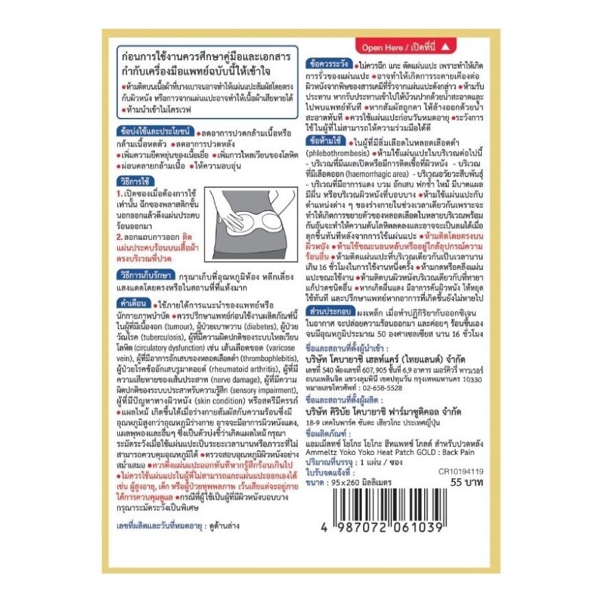Ammeltz Heat Patch GOLD — Back Pain Air-activated heat patch generates heats up to 50C. The natural therapeutic heat will last for 16 hours helps relieve back pain. Warming effect lasts for 10 hours to relieve back pain and back stiffness. Simply stick on clothing or underwear around the base of the back, heat will spread through the area and penetrate to the source of pain. Effectively improve blood circulation, relieve stiffness and muscular pain. Thin and simple design which can be used at anywhere and anytime. ใบอนุญาตโฆษณาเลขที่ ฆพ.707/2565
