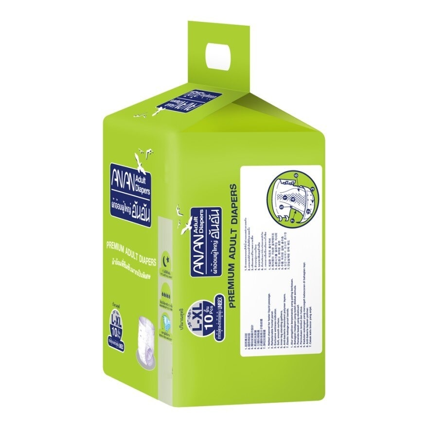 ANAN Adult diapers size L-XL 10 pieces (Hip size 38-58) with maximum the maximum absorbency 1,500 CC. Netted channel for faster liquid passage and prevent backflow. Refastenable frontal panel provides adjustable and secure fastening of adhesive tapes. Exclusive wetness-indicator. Sofy,smooth surface. Inner-leg standing gathers prevent side leakage. Anti-bacteria Absorbent polymer layers. Elastic leakage-proof bands. Suitable for elderly who need assistance and lying on bed for long time. 1 PC lasts all night. Extra thick and soft.
