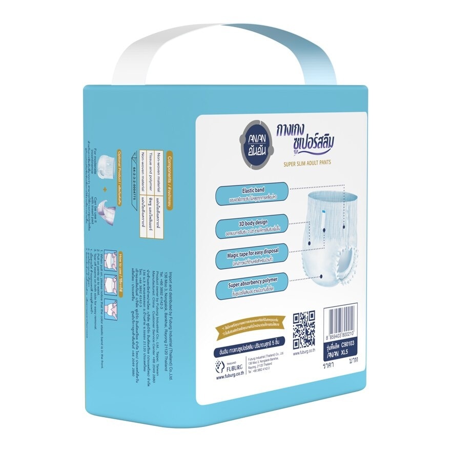 Anan super slim pants size XL (Waist size 52"-68") is designed for unisex with the maximum absorbency 500 CC. Cloth like soft surface lighter and thinner design for air flow. Elastic waist band design fits well like a underwear. Inner-leg standing gathers prevent side leakage. Tape for easy disposal