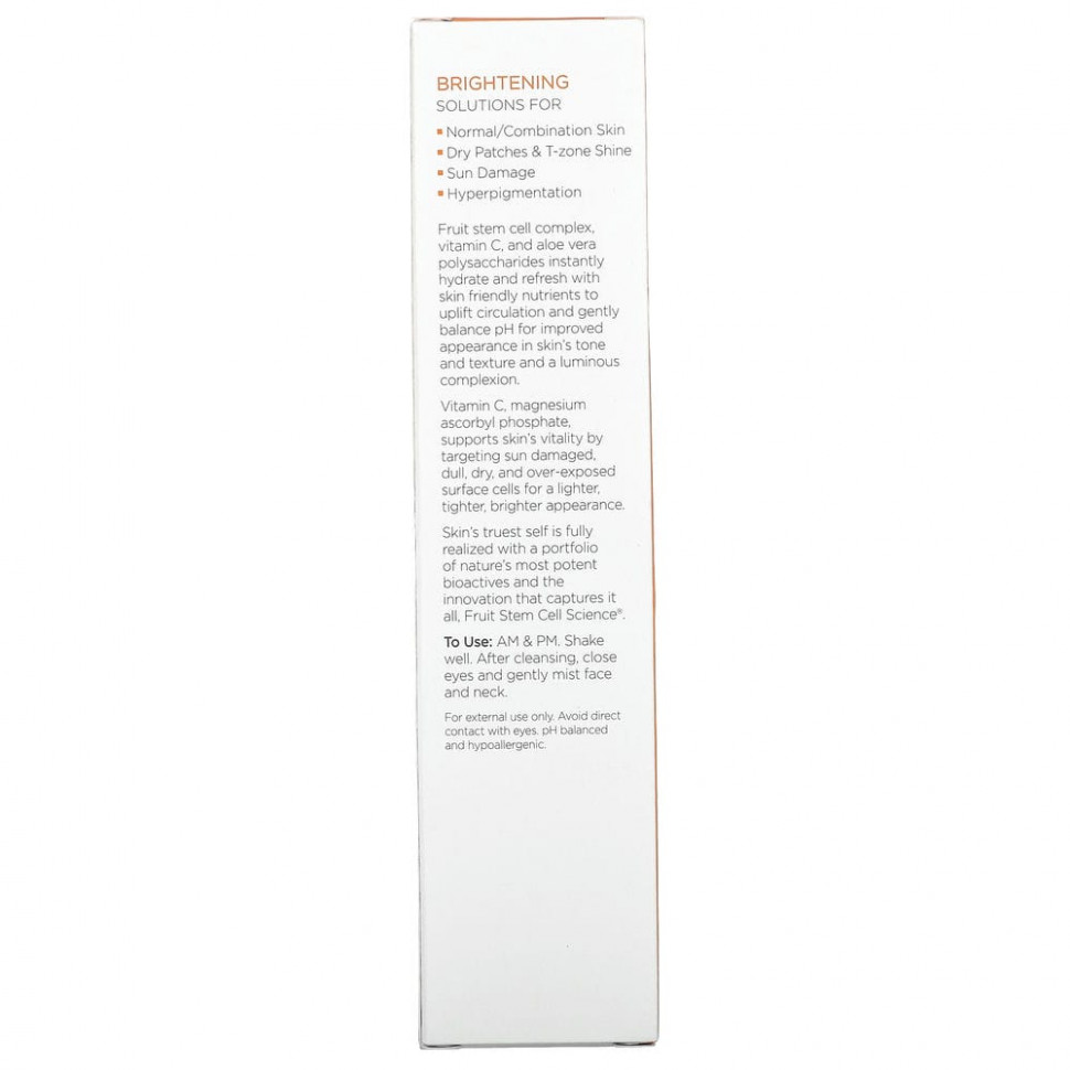 Комплекс стволовых клеток плодов, витамин C и полисахариды алоэ вера мгновенно увлажняют и освежают кожу питательными веществами, которые улучшают кровообращение и мягко балансируют уровень pH для улучшения внешнего вида и текстуры кожи, а также сияющего цвета лица.