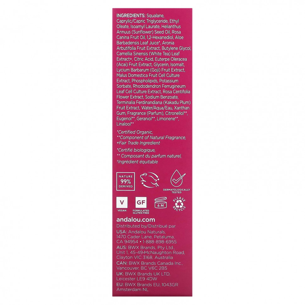 Сквалан, каприловый / каприновый триглицерид, этилолеат, изоамил лаурат, подсолнечное масло (Helianthus annuus), масло шиповника (Rosa canina), 1,2-гександиол, сок листьев алоэ вера (Aloe barbadensis)*, экстракт плодов аронии арбутифолии, бутиленгликоль, экстракт листьев белого чая (Camellia sinensis), лимонная кислота, экстракт ягод асаи (Euterpe oleracea), глицерин, изомальт, экстракт ягод годжи (Lycium barbarum), экстракт культуры клеток плодов яблони домашней (Malus domestica), фосфолипидов, сорбат калия, экстракт культуры листьев альпийской розы (Rhododendron ferrugineum), экстракт цветков розы столистной (Rosa centifolia), бензоат натрия, экстракт плодов сливы какаду (Terminalia ferdinandiana), вода, ксантановая камедь, отдушка (парфюмерная композиция), цитронеллол**, эвгенол **, гераниол**, лимонен **, линалоол **.