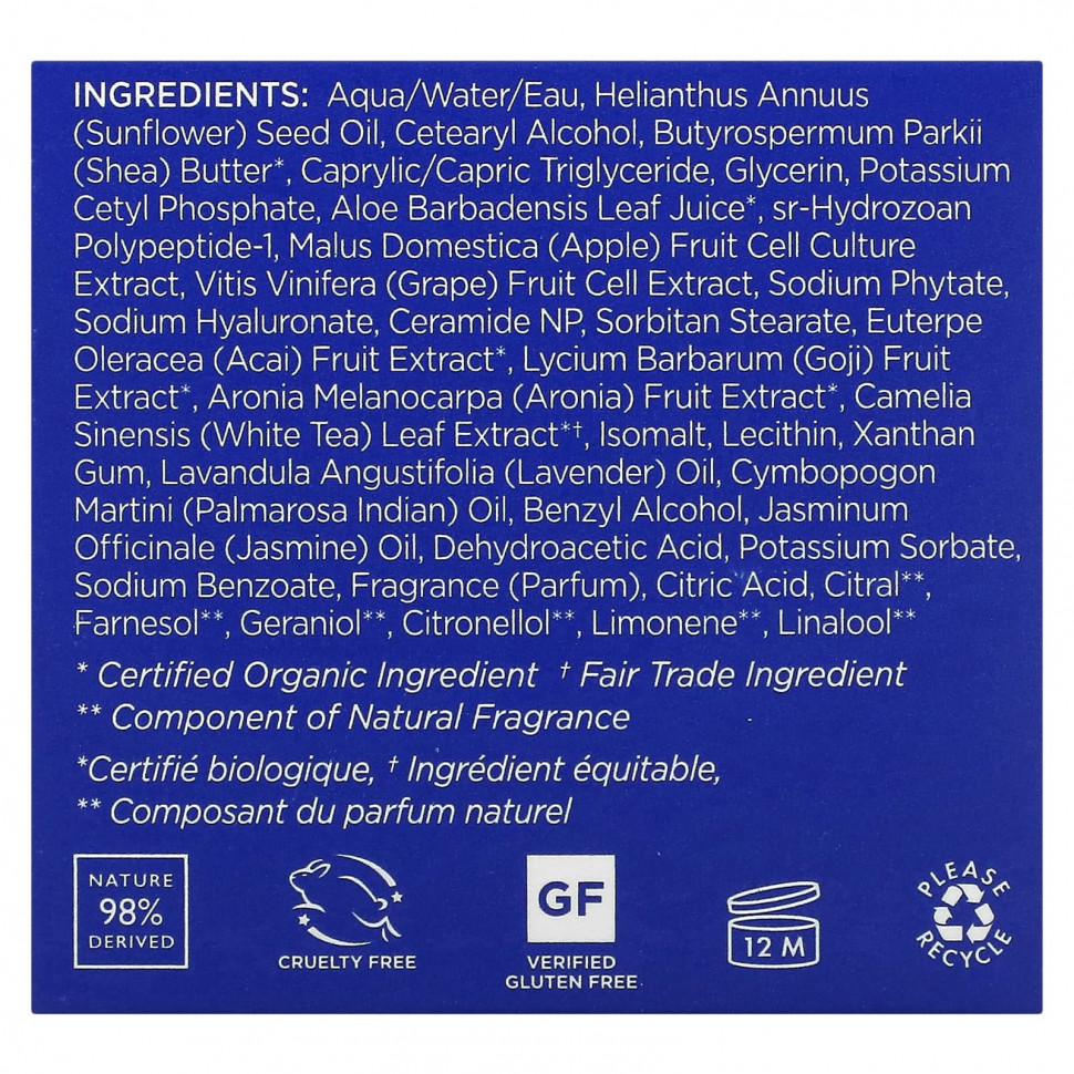 Вода, масло подсолнечное (Helianthus annuus), цетеариловый спирт, масло ши (Butyrospermum parkii)*, каприловый/каприновый триглицерид, глицерин, цетилфосфат калия, сок листьев алоэ вера (Aloe barbadensis)*, SR-гидрозоан полипептид-1, экстракт культуры клеток плодов яблони домашней (Malus domestica), экстракт клеток плодов винограда (Vitis vinifera), фитат натрия, гиалуронат натрия, керамид NP, сорбитан стеарат, экстракт плодов асаи (Euterpe oleracea) *, экстракт плодов годжи (Lycium barbarum) *, экстракт плодов аронии (Aronia melanocarpa) *, экстракт листьев белого чая (Camellia sinensis)*+, изомальт, лецитин, ксантановая камедь, лавандовое масло (Lavandula angustifolia), масло индийской пальмарозы (Cymbopogon martini), бензиловый спирт, масло жасмина (Jasminum officinale), дегидроуксусная кислота, сорбат калия, бензоат натрия, отдушка (парфюмерная композиция), лимонная кислота, цитраль фарнезол **, гераниол **, цитронеллол **, лимонен **, линалоол**
