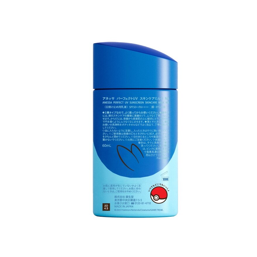 Anessa Perfect UV Sunscreen Skincare Milk NA SPF50+ PA++++ Ultimate Skincare UV Milk, improves the appearance of dark spots with seamless Outstanding UV Protection. Effectively protects areas prone to dark spots such as around the eyes and cheeks. With Double Protective Veil Technology Auto Repair Technology The surface of the protective veil is automatically smoothed out to prevent unevenness Auto Booster Technology The UV protection veil automatically becomes even stronger with sweat, water, heat, and air moisture Prevents dry skin caused by UV exposure while also improving skin’s moisture Lasting moisturizing effect 8 hours Beautifying effects for clear, glowing skin Protects skin from micro particles in the air micro dust Can be used as makeup primer Very water resistant / Rub resistant — Ocean friendly จากผลการทดสอบทางคลินิก ในกลุ่มตัวอย่าง 27 คน โดย Guangzhou Landproof Testing Co.,Ltd. สาธารณรัฐประชาชนจีน ในเดือนธันวาคม 2565