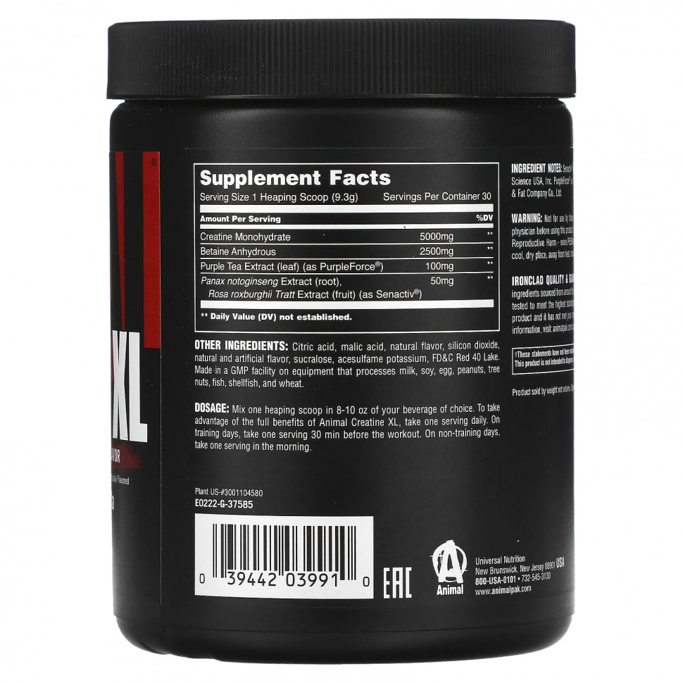 Креатин — один из самых эффективных, проверенных и действительно эргогенных ингредиентов. Доказано, что он обладает способностью увеличивать силу и производительность, улучшать сухую мышечную массу и наращивать объем мышечной массы среди многих других преимуществ. Animal Creatine XL идет еще дальше и дополняется дополнительными ингредиентами синергетического действия. Если вы серьезно относитесь к тренировкам, Animal Creatine XL должен быть частью вашего ежедневного рациона.
