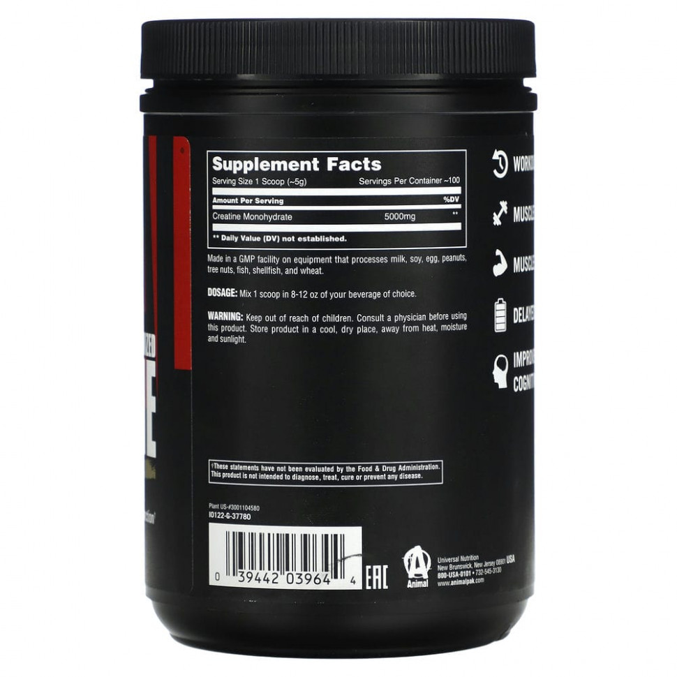 Сосредоточьтесь на тяжелой работе, зная, что с Animal Creatine вы сможете восстановиться. Он содержит наиболее легко усваиваемый моногидрат креатина. Креатин питает мышцы, обеспечивая высокоэнергетическую связь в мышцах и нервной ткани для поддержания уровня АТФ во время мышечного сокращения. Клинические исследования показали, что повышенный уровень креатина в организме также способствует оптимальному восстановлению после тренировок, ускоряет рост сухой мышечной массы и отсрочивает наступление мышечной усталости.
