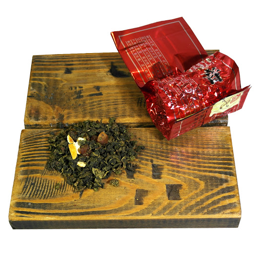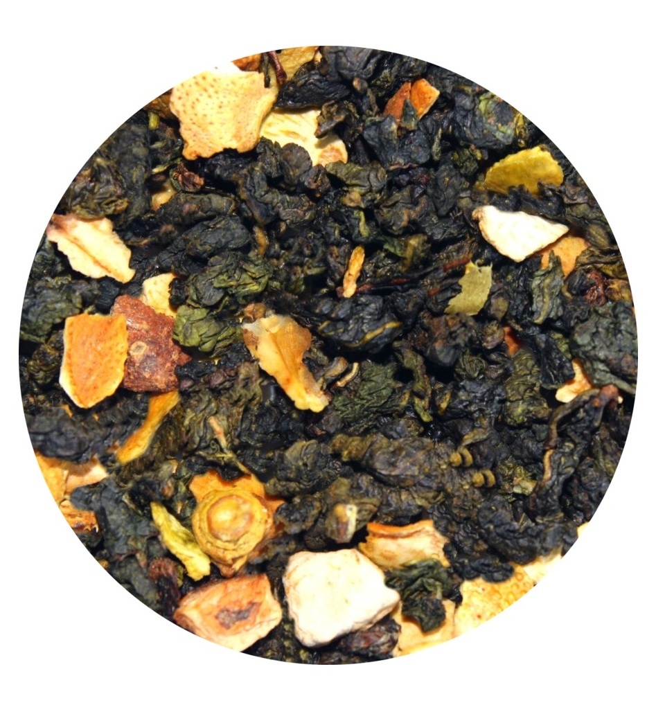 Классический светлый улун из провинции Фуцзянь, смешанный с апельсиновой цедрой и цукатами.