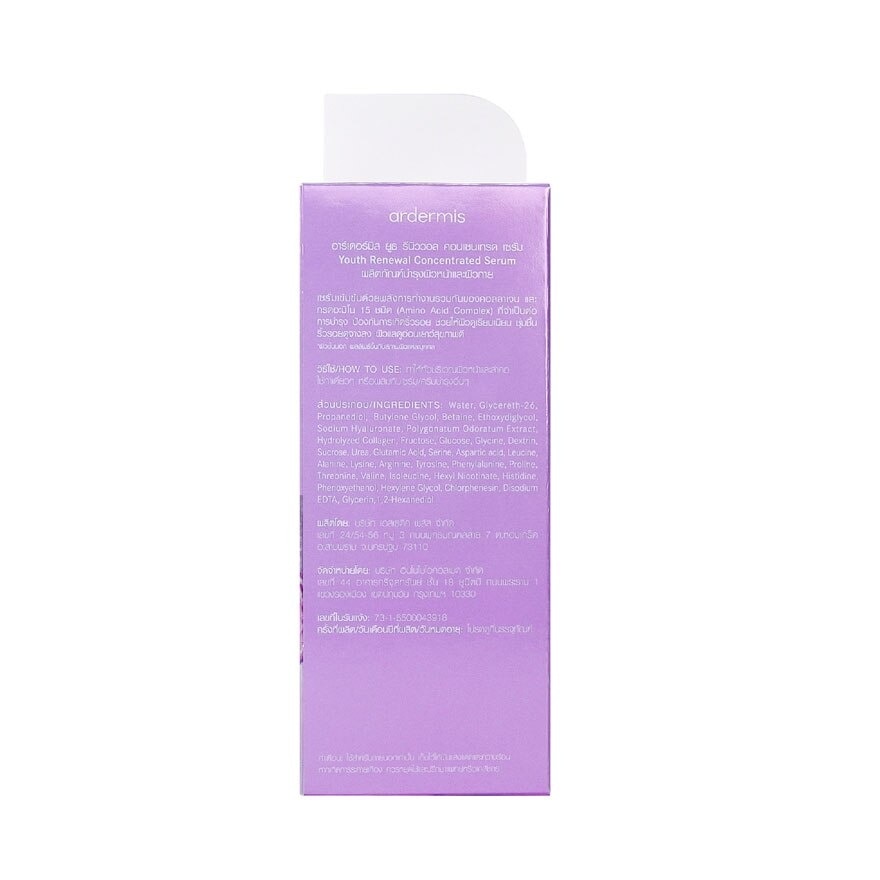 Ardermis Serum Youth Renewal Concentrated This concentrated anti-aging serum is the perfect combination working of Hydrolyzed Collagen and 15 types of Amino acid by targeting to visible wrinkles and fine lines that are the signs of aging.With this powerful of collagen,the serum helps the skin regain a firmness dut to the decline of collagen production that make the skin sagging.Amino acid which is the one of factors to product protien of skin's cell and suppress a disintegration of collagen fibrils that is found in the skin's own natural moisturizing factors and provides enhanced barrier support,elasticity,and balance.The formula intensively smooths skin helps to nourish skin,leaving skin looking healthy and youthful.Formulated for all skin types.