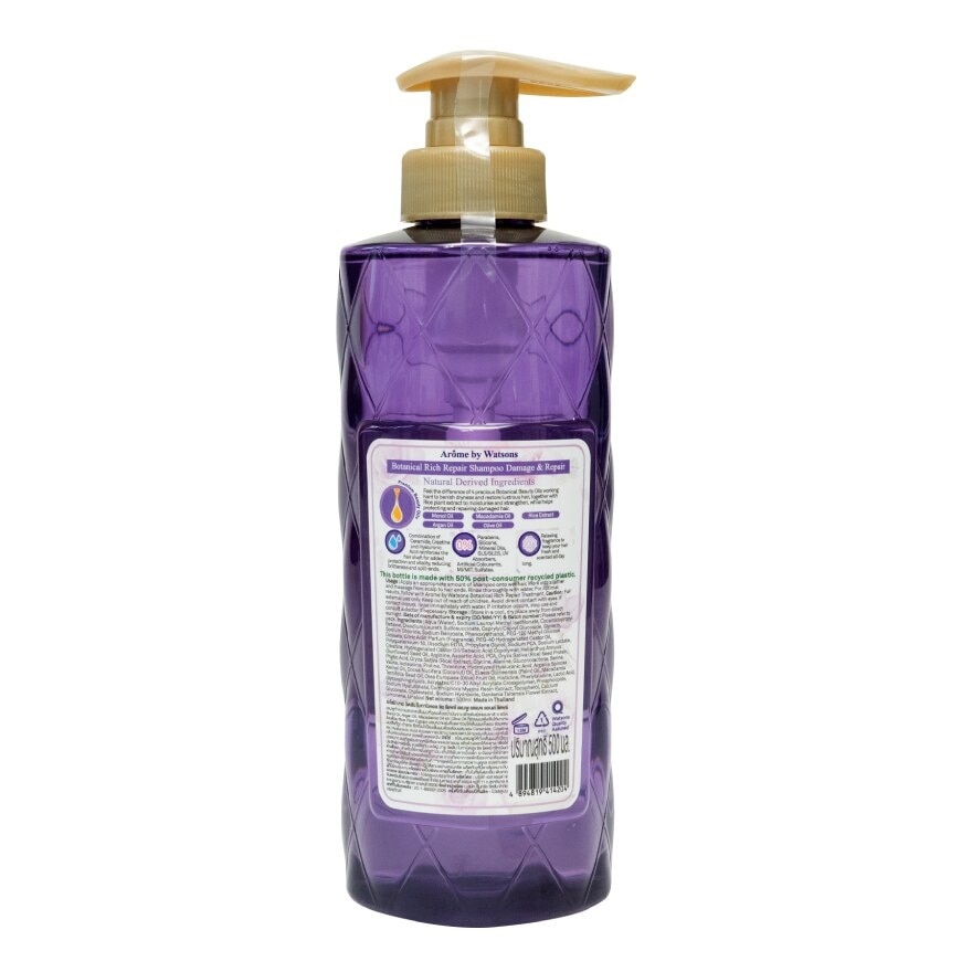 Arome by Watsons Botanical Rich Repair Shampoo Damage amp; Repair is Feel the difference of 4 precious Botanical Beauty Oils working hard to banish dryness and restore lustrous hair, together with Rice plant extract to moisturise and strengthen, while helps protecting and repairing damaged hair. Free From Parabens, Silicone, Mineral Oils, SLS/SLES, UV Absorbers, Artificial Colourants, MI/MIT, Sulfates. Ingredient you can trust with a reduced environmental impact. This product was formulated without over 20 unwanted ingredients. Additionally, the bottle is made with 50 post-consumer recycled plastic.