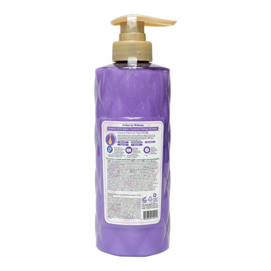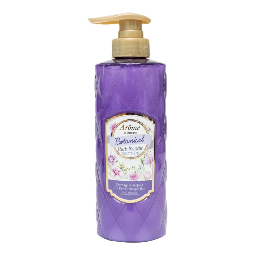 Arome by Watsons Botanical Rich Repair Treatment Damage amp; Repair is Feel the difference of 4 precious Botanical Beauty Oils working hard to banish dryness and restore lustrous hair, together with Rice plant extract to moisturise and strengthen, while helps protecting and repairing damaged hair. Free From Parabens, Silicone, Mineral Oils, SLS/SLES, UV Absorbers, Artificial Colourants, MI/MIT, Sulfates. Store in a cool, dry place away from direct sunlight. This product was formulated without over 20 unwanted ingredients. Additionally, the bottle is made with 50 post-consumer recycled plastic.