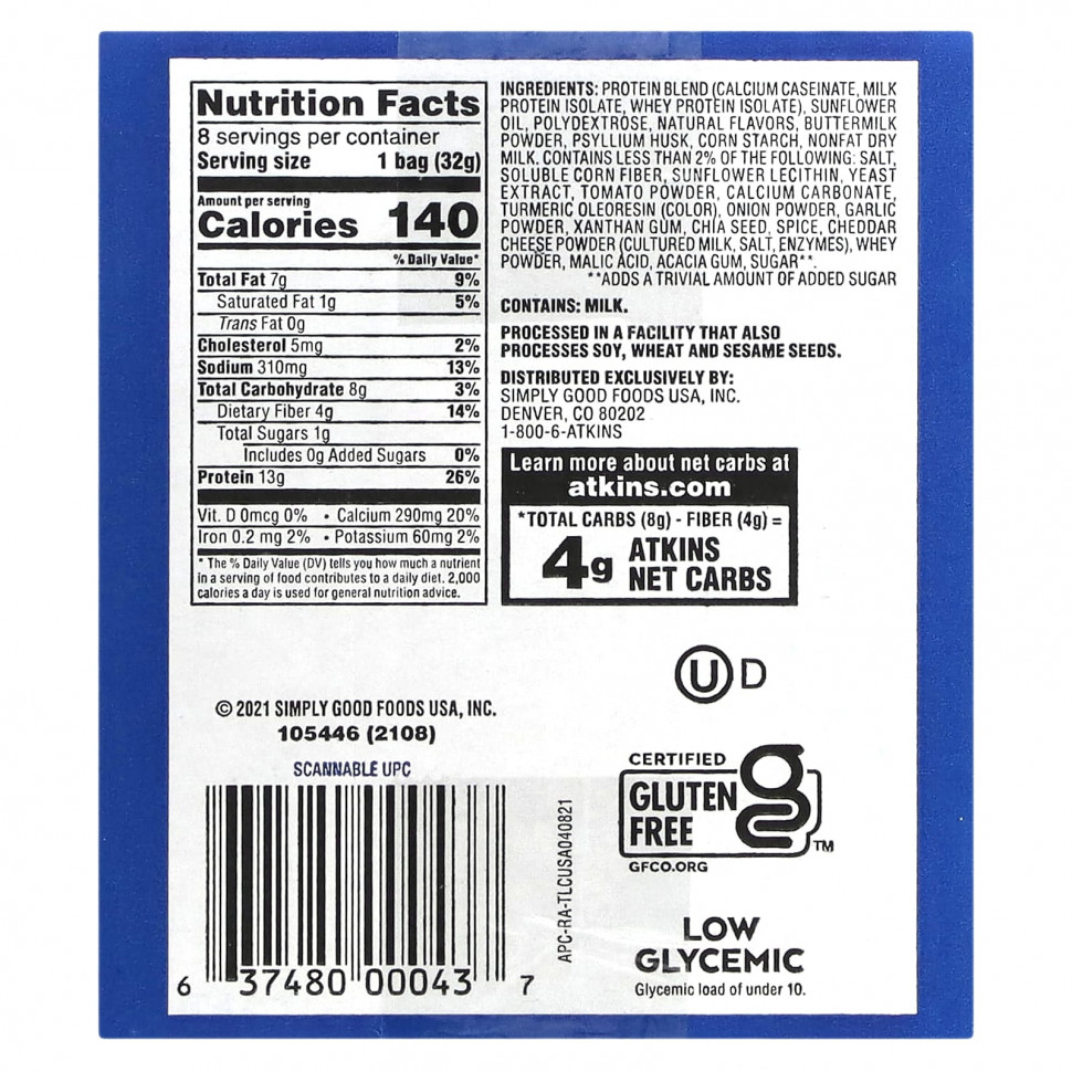 Протеиновая смесь (казеинат кальция, изолят молочного протеина, изолят сывороточного протеина), подсолнечное масло, полидекстроза, натуральные ароматизаторы, пахта в порошке, шелуха семян подорожника, кукурузный крахмал, обезжиренное сухое молоко. содержит менее 2% следующих ингредиентов: соль, растворимая кукурузная клетчатка, подсолнечный лецитин, экстракт дрожжей, порошок из томатов, карбонат кальция, олеорезин куркумы (краситель), луковый порошок, чесночный порошок, ксантановая камедь, семена чиа, специи, порошок сыра чеддер (простокваша, соль, ферменты), сывороточный порошок, яблочная кислота, аравийская камедь, сахар **.