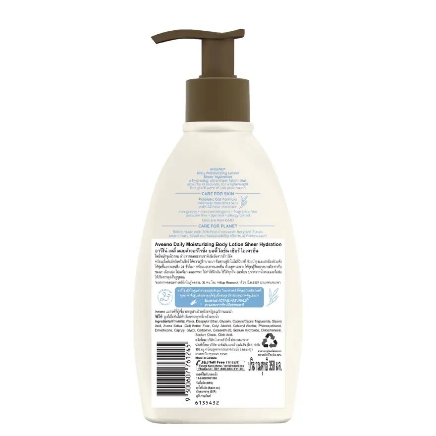 Aveeno Daily Moisturizing Body Lotion Sheer Hydration. This sheer hydration body lotion intensely moisturizes dry skin for 24 hours & absorbs in seconds. With soothing oat, its fragrance-free formula nourishes skin with a lightweight, breathable feel. -Sheer hydration moisturizing oat body lotion -Absorbs in seconds & moisturizes for 24 hours -Lightweight & fragrance-free for dry skin This Prebiotic Oat Formula locks in moisture to nourish and help improve skins natural moisture barrier. The clinical benefits of Aveeno Oat in dry skin have been demonstrated through extensive research across diverse skin conditions and populations.