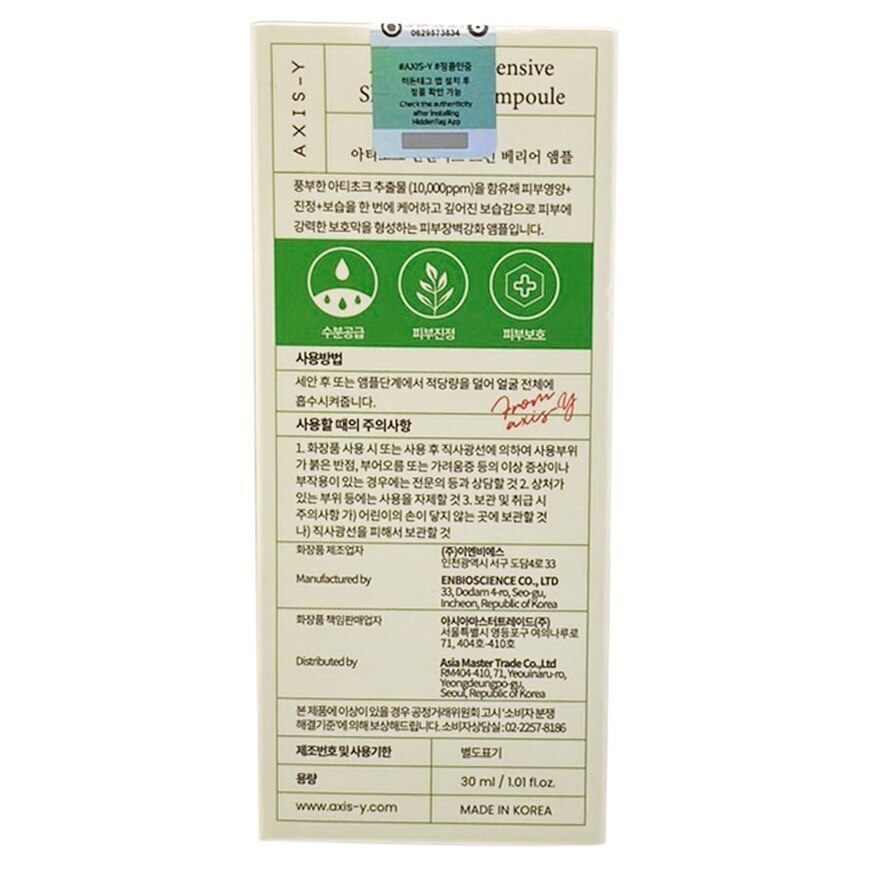 Axis-Y Artichoke Intensive Skin Barrier Ampoule After cleansing and preparing the skin, this step focuses on aiding the recovery of the damaged skin barrier due to environmental stressors. Ingredient Water, Aloe Barbadensis Leaf Water, Butylene Glycol, Sodium Hyaluronate, Centella Asiatica Extract, Glycerin, Betaine, Propanediol, Glycyrrhiza Uralensis (Licorice) Root Extract, Hieracium Umbellatum Extract, Cynara Scolymus (Artichoke) Leaf Extract (10,000ppm), Sorbitol, Aloe Barbadensis Leaf Extract, Dioscorea Japonica Root Extract, Laminaria Japonica Extract, 1,2-Hexanediol, Xanthan Gum, Carbomer, Linum Usitatissimum (Linseed) Seed Extract, Hibiscus Esculentus Fruit Extract, Aloe Barbadensis Leaf Juice, Arctium Lappa Root Extract, Hibiscus Mutabilis Flower Extract, Corchorus Olitorius Leaf Extract, Rheum Palmatum Root Extract, Althaea Rosea Flower Extract, Dimethyl Sulfone, Chlorphenesin, Ethylhexylglycerin, Polyglutamic Acid, Beta-Glucan, Arginine, Allantoin, Adenosine Brand Concept No Paraben No Phthalates No Mineral Oil No Formaldehyde No Sulfates No Petrolatum No Artificial Colors No Artificial Fragrances