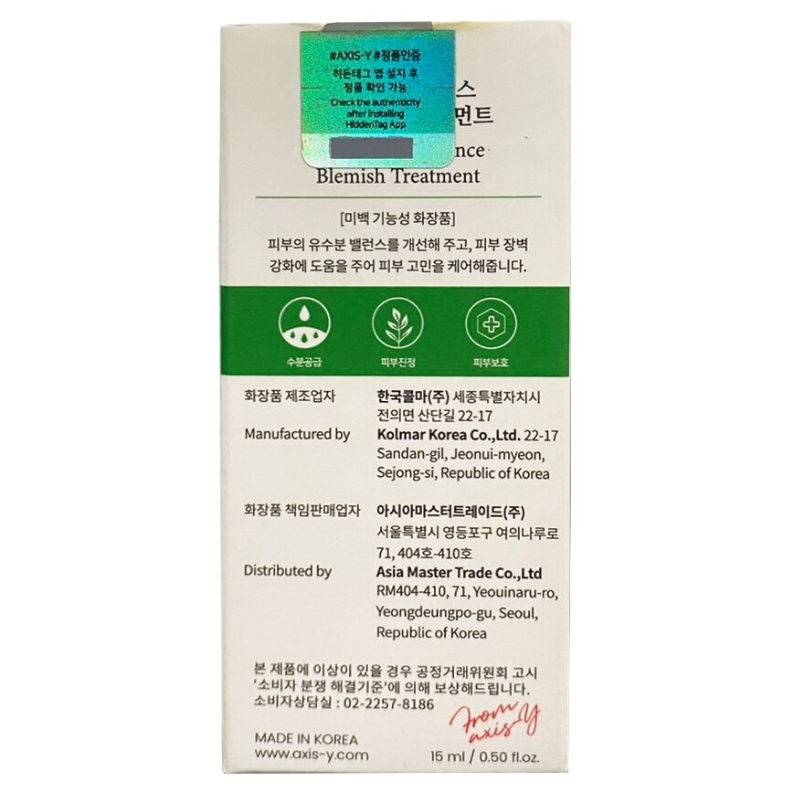 Axis-Y Spot The Difference Blemish Treatment Treats and relieves troubled skin. This serum treats acne targeted on specific problematic area on the skin. First aid for acne and quick relief, the ceramide capsules melt once it touches the skin to lock in moisture. It can be used all over the face, or targeted specifically on certain area or spot. Ingredient Water, Glycerin, Propanediol, 1,2-Hexanediol, Glycereth-26, Niacinamide, Caprylic/Capric Triglyceride, Aloe Barbadensis Leaf Extract, Althaea Rosea Flower Extract, Laminaria Japonica Extract, Eclipta Prostrata Leaf Extract, Centella Asiatica Extract, Ficus Carica (Fig) Fruit Extract, Ulmus Davidiana Root Extract, Amaranthus Caudatus Seed Extract, Camellia Sinensis Leaf Extract, Monardadidyma Leaf Extract, Hydrangea Macrophylla Leaf Extract, Mentha Aquatica Extract, Sasa Quelpaertensis Extract, Melaleuca Alternifolia (Tea Tree) Leaf Extract, Melia Azadirachta Leaf Extract, Eclipta Prostrata Extract, Cinnamomum Camphora (Camphor) Leaf Extract, Cryptomeria Japonica Leaf Extract, Pinus Pinaster Bark / Bud Extract, Rosmarinus Officinalis (Rosemary) Leaf Oil, Hydrogenated Lecithin, Chamaecyparis Obtusa Water, Trehalose, Octyldodeceth-16, Acrylates/C10-30 Alkyl Acrylate Crosspolymer, Tromethamine, C12-14 Pareth-12, Butylene Glycol, Xanthan Gum, Disodium Edta, Ceramide NP, Fructooligosaccharides, Beta-Glucan, Hydrolyzed Hyaluronic Acid, 4-Terpineol, Glycyrrhiza Glabra (Licorice) Rhizome/Root, Moringa Oleifera Seed Oil, Glycolic Acid, Salicylic Acid, Ethylhexylglycerin Brand Concept No Paraben No Phthalates No Mineral Oil No Formaldehyde No Sulfates No Petrolatum No Artificial Colors No Artificial Fragrances