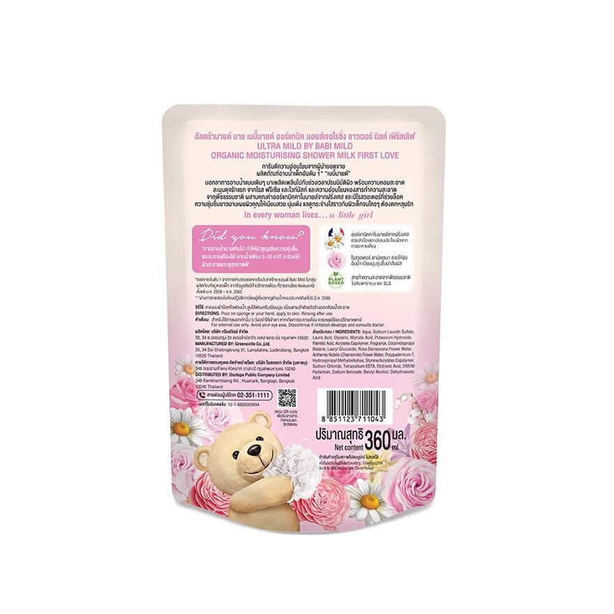 Babi Mild Ultra Mild Organic Shower Milk First Love Guarantee mildness from no.1 bestselling brand in baby liquid soap Babi Mild Ultra Mild Organic Shower Milk purifies your skin with Hybrid cleanser (Plant based + soap based surfactant) formulation but mild to skin to ensure your skin is thoroughly cleansed yet still feels soft and alive, not dry and tired. With clean and gentle scent like first love from Rose, Freesia and White Musk. Enriched only with only goodness to revitalizes your skin to give you that baby skin glow you love. With the scent of Rose and Cyclamen