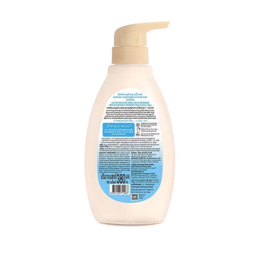 Guarantee mildness from no.1 bestselling brand in baby liquid soap Babi Mild Ultra Mild Organic Shower Milk purifies your skin with Hybrid cleanser (Plant based + soap based surfactant) formulation but mild to skin to ensure your skin is thoroughly cleansed yet still feels soft and alive, not dry and tired. With soft scent of milk mixed with clean and fresh scent from white flowers Orange Flower and Jasmine. Enriched only with only goodness to revitalizes your skin to give you that baby skin glow you love. With the scent of Rose and Cyclamen