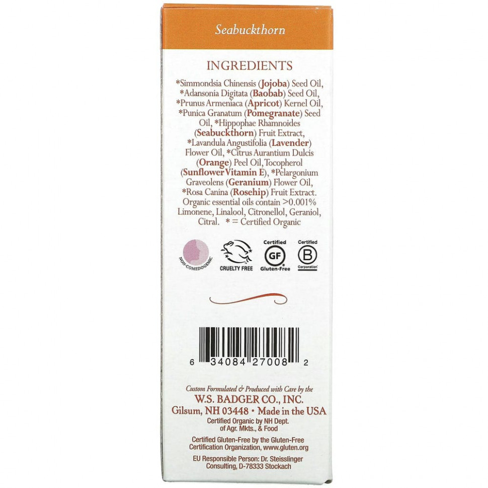 Масло для лица из облепихи барсука — это богатая витаминами сертифицированная органическая смесь ценных растительных масел, разработанная для увлажнения, питания и защиты нормальной и сухой кожи. Эта цветочно-фруктовая смесь содержит экстракт облепихи CO2, который содержит витамины A, B, C, E и K, а также жирные кислоты Омега 3, 6, 7 и 9.