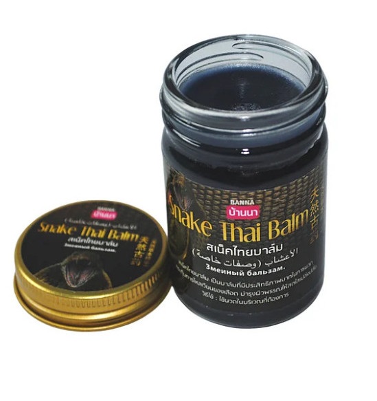 Черный змеиный бальзам включает в себя компоненты кожных, костных тканей и внутреннего жира Королевской Кобры с добавлением яда.