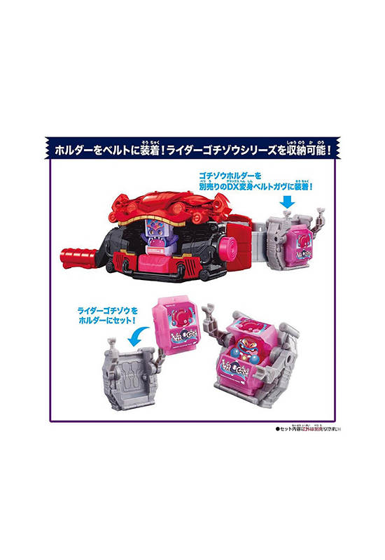 Attach the «Gochizo Holder» to the «DX HENSHIN BELT GAVV (Sold separately)»! You can carry the «Rider Gochizo Series» as a set. By attaching the included «Bullcan Gochizo» to HENSHIN BELT, you can enjoy summoning KAMEN RIDER GAVV ‘s machine, the «Bullcan Buggy.»