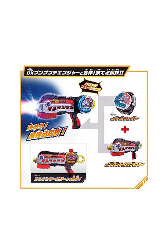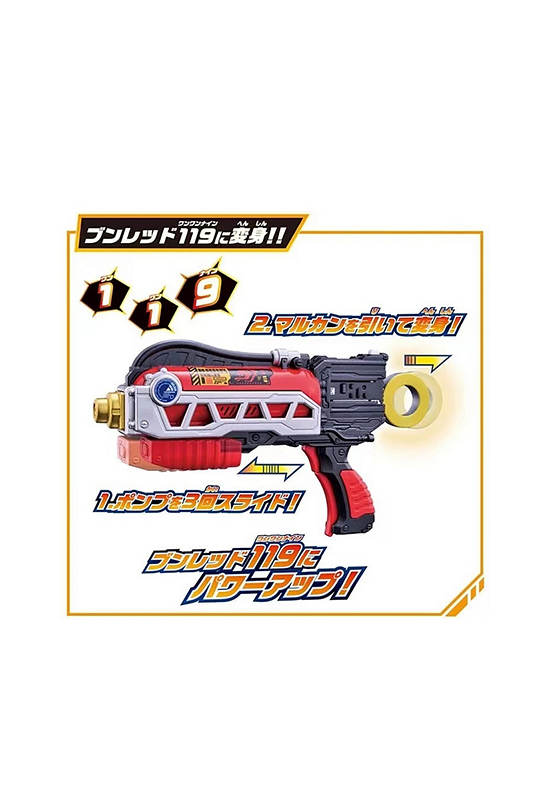 BANDAI The DX Zoonzoom Shokablaster, from Bakuage Sentai Boomboomger, is a fire extinguisher-shaped transformation gun used by Bunred for power-ups. Slide the pump three times and pull the Marukan to trigger an exciting power-up transformation into Bunred 119, bringing action-packed fun to fans.
